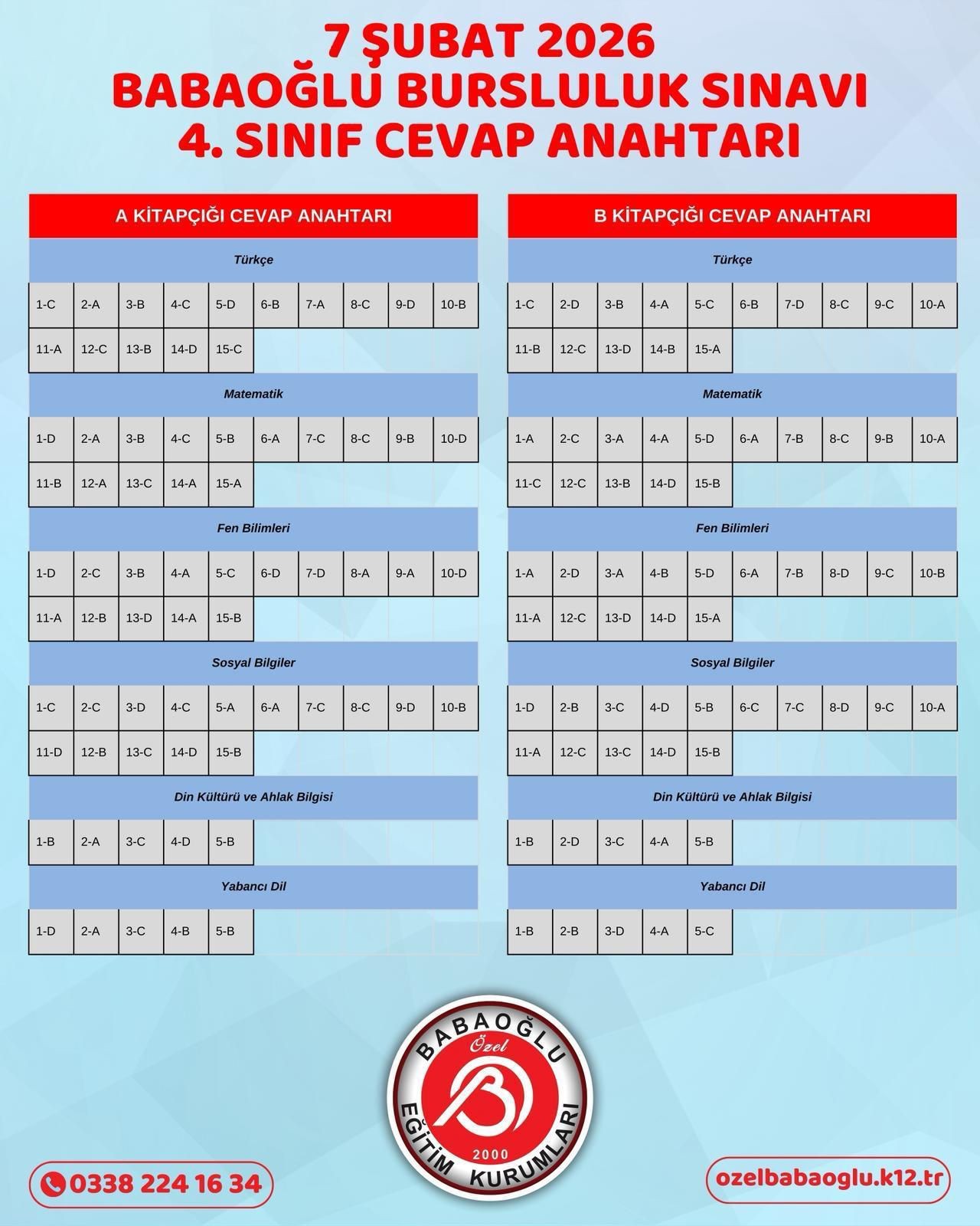 7 ŞUBAT 2026 BABAOĞLU BURSLULUK SINAVI 4. SINIF CEVAP ANAHTARI!