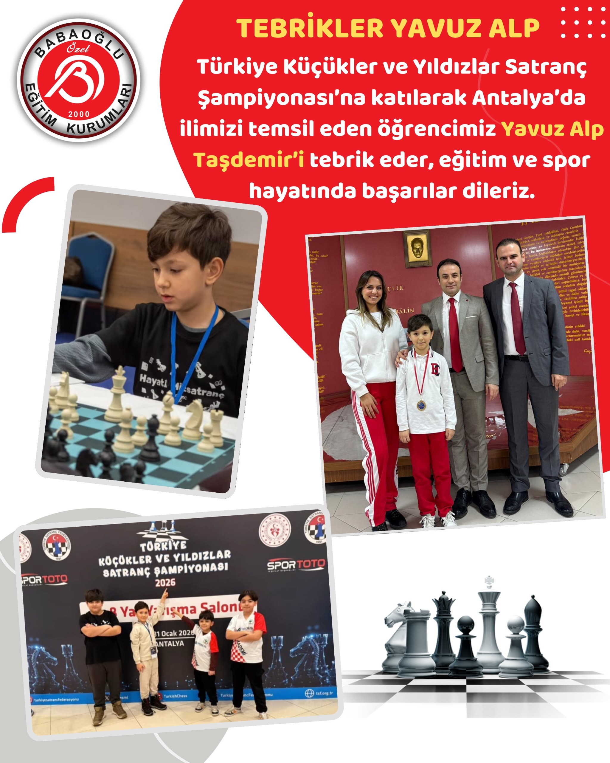 Türkiye Küçükler ve Yıldızlar Satranç Şampiyonası’nda Antalya’da ilimizi başarıyla temsil eden öğrencimiz Yavuz Alp Taşdemir’i tebrik ediyor, eğitim ve spor hayatında nice başarılar diliyoruz.