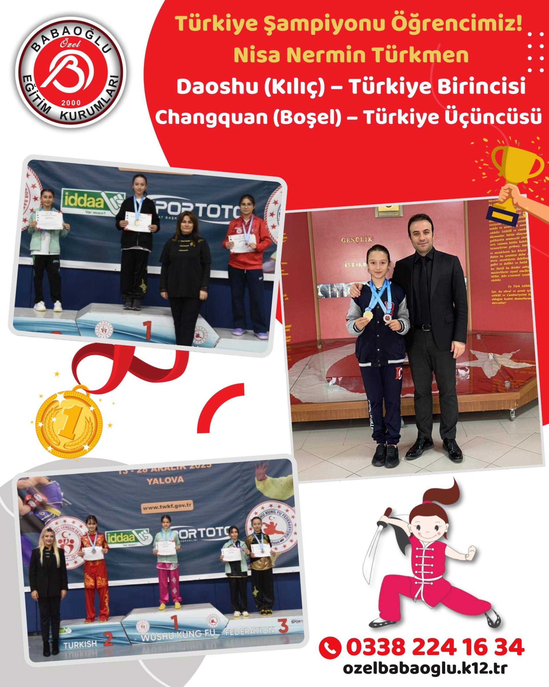 Babaoğlu Koleji olarak öğrencimiz Nisa Nermin Türkmen’in, Yalova’da düzenlenen 2026 Türkiye Wushu Kung Fu Şampiyonası’nda elde ettiği gurur verici derecelerle büyük bir başarıya imza atmasından mutluluk duyuyoruz.